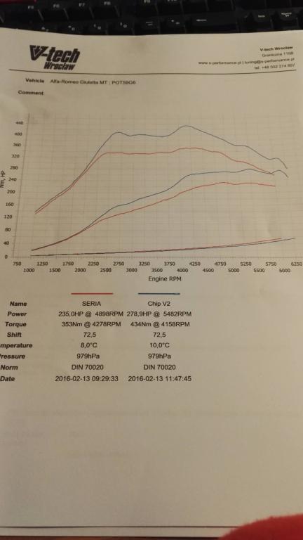 Ładnie Ci nakreśliło. W giulieccie jest coś ala szpera + całkiem przyjazne ASR, niby to tylko elektronika lecz daje radę, auto jest lekkie to naprawdę wyrywa do przodu, kontrola trakcji świeci bardzo często ale samochód zapieprza w miarę stabilnie bez uślizgów (bez niej to bym nie ruszył z miejsca). Peak jest - czemu? Nie wiem, domniemam, że to poniekąd charakterystyka DNA, w serii też był jak się przyjrzysz, mniej widoczny. Po za tym to tryb normal, nie dało się hamować na dynamicu ze względu na hamownie jednoosiową i błędem trakcji z nią związanym - wykres przed pokrywa się z zachowaniem, a mianowicie Julka zachowuje się jak auto a la wolnossące - bardzo wyrywa od ok 4tys. Zwróc uwagę na nagły wzrost koni przy tych samych obrotach. W dynamicu nie ma tego efektu i podejrzewam, że te linie układają się trochę inaczej (nawet w danych max moment obrotowy osiągany jest przy innych obrotach) inne są też odczucia z jazdy i co tu dużo mówić, o ile po chipie na normalu zapier... to na dynamicu mam problem oczy prosto trzymać, tak przyjemnie wciska. :P Aczkolwiek muszę się zastanowić czy jazda na dynamicu nie przyspieszy w obecnym setupie zużycia sprzęgła które wymaga powoli inwestycji tak czy siak.