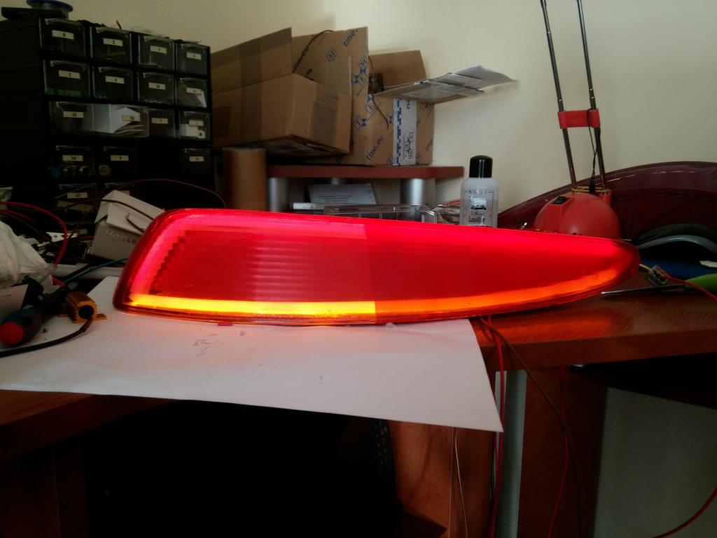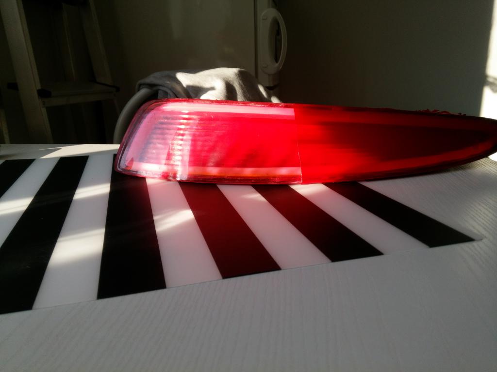 Lampa już złożona, Próbnie zamontowana w samochodzie. Filmik będzie jutro bo dziś już za ciemno i tele nie ogarnia. Na pół lampy położona dodatkowo folia, dzięki temu moim zdaniem lampa lepiej wygląda. Zostało jeszcze parę szczegółów do dogrania lecz istotnych.