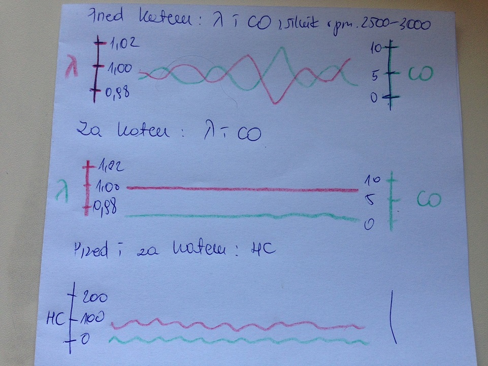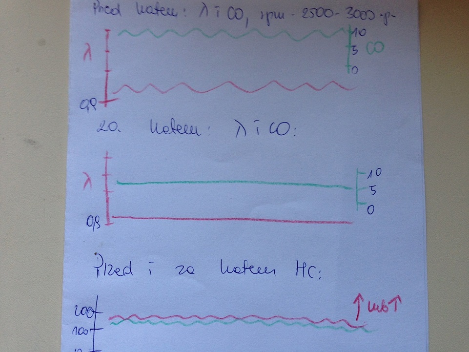 Badasz za katalizatorem. Normalnie na 2500 – 3000 rpm powinno być tak dla typów JTS, przed i za katalizatorem powinno być tak.