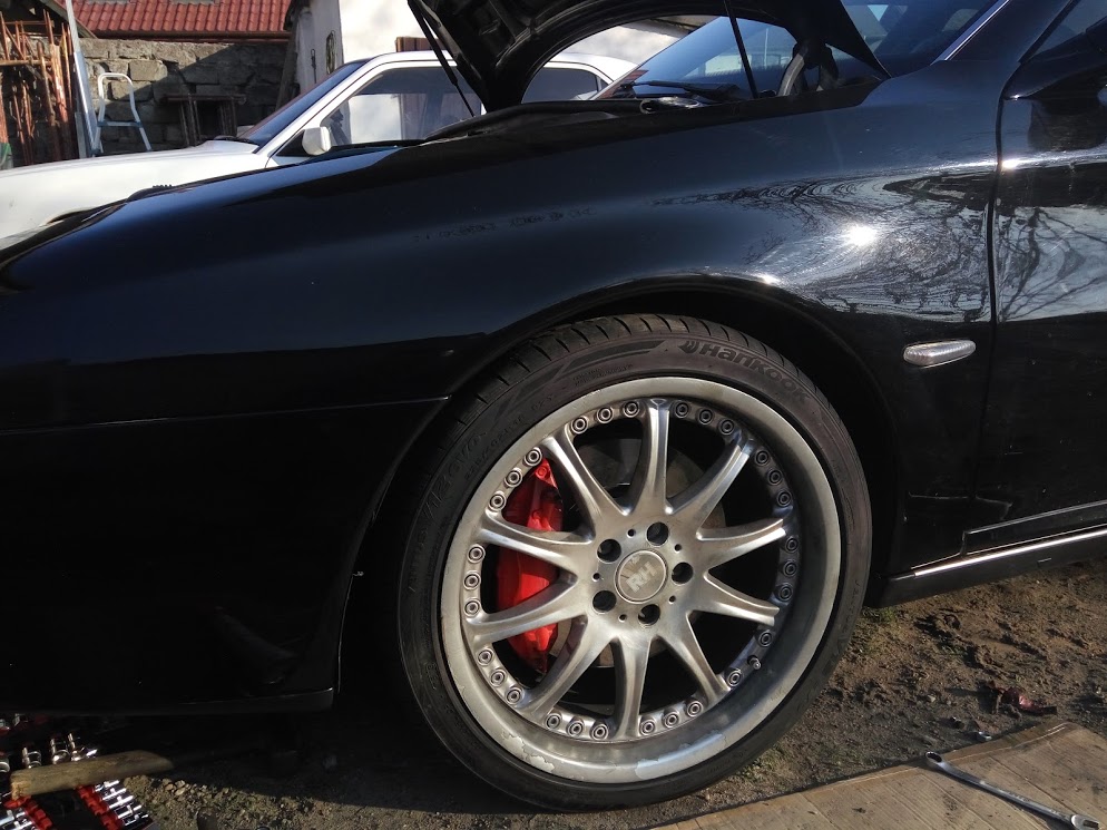 Dziś przy okazji wymiany wahaczy na szybkości wsadziłem to koło 18' co wcześniej pasowałem do srebrnej. Dla informacji nie ma sprężyn Eibacha tylko białe Noviteca. Ile w dół nie mam zielonego pojęcia bo nigdzie nie znalazłem info o tym.