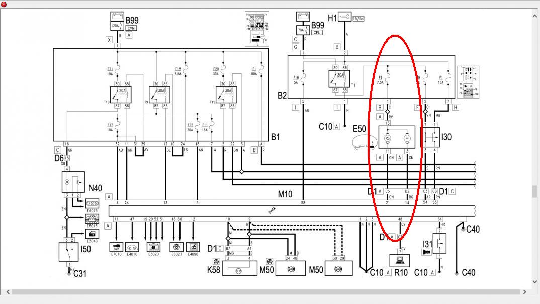 Na schemacie wcześniej szukaj E50 pomiędzy skrzynką B2 a ECU M10 i Złączem C10 a stykiem I30 :)