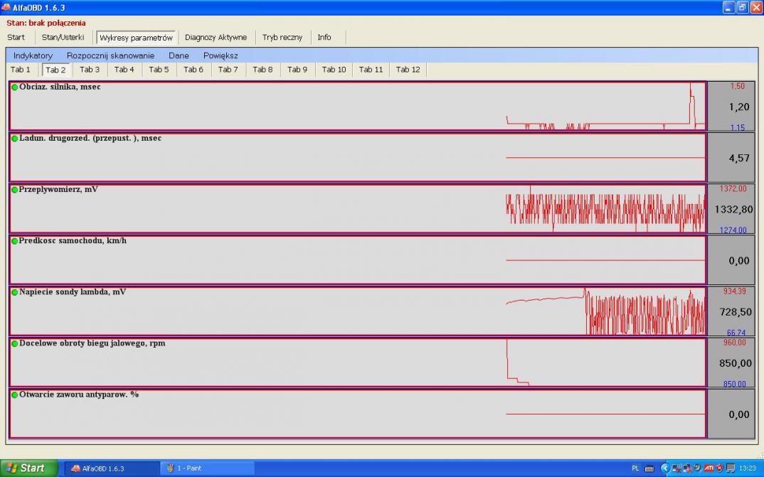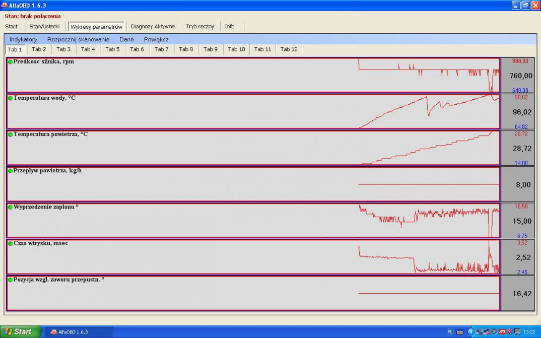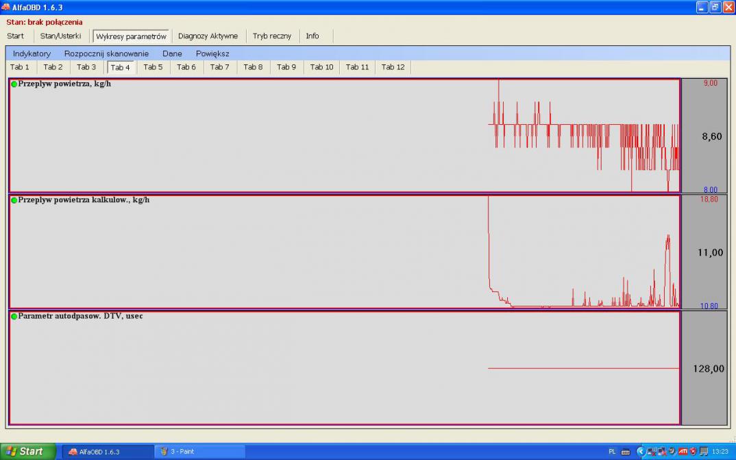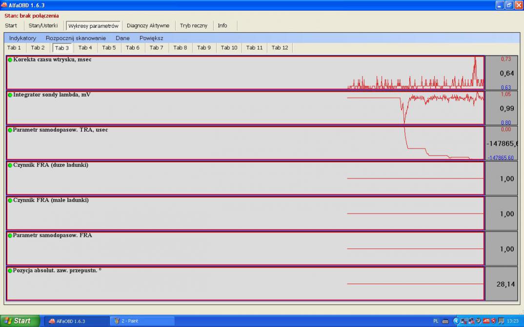 Pomiary były robione następująco: zimny silnik, reset parametrów i diagnoza (wykresy przedstawiają pracę do nagrzania się silnika i podczas adaptacji)