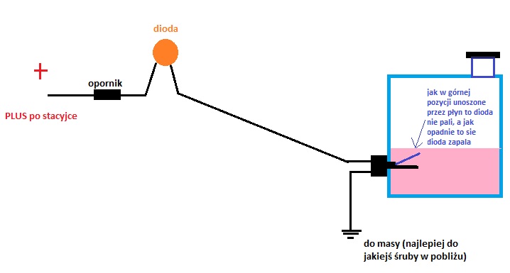 diodę użyłem pomarańczową, bo rezerwa paliwa też jest pomarańczowa, spiłowałem ją delikatnie aby nie wystawała z oprawki, opornik warto dać większy to nie będzie tak intensywnie świecić w aucie i rozpraszać np. w nocy