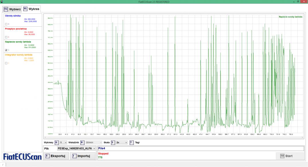 Co do lambdy: a maksymalne napięcie nie jest za niskie? z tego co widać i z poprzednich pomiarów - ledwo dobija do 800mV, czasem wskoczy większe (dlatego min/max jest w miarę, choć jak zauważyłeś minimalne jest za niskie).