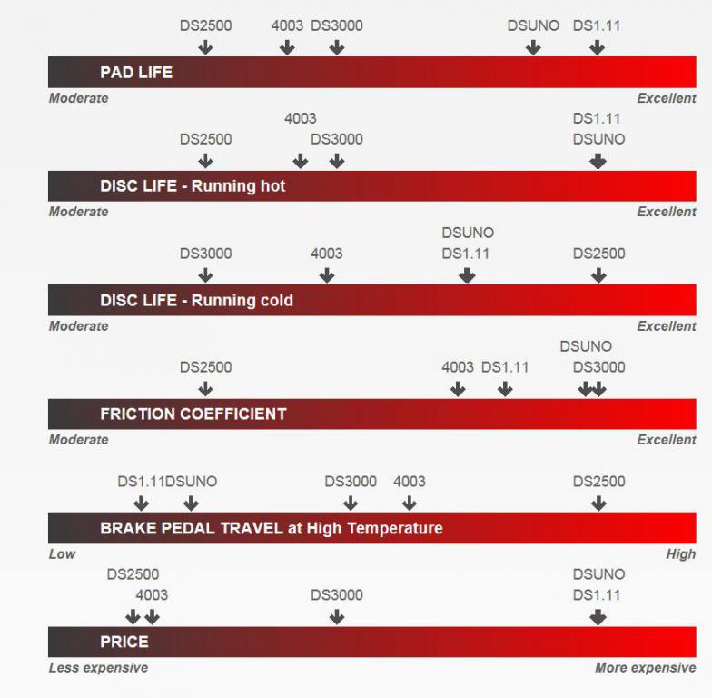 Polecam sprawdzić jeszcze OMP Road & Sport, przyzwoita cena, a ponoć właśnie też między DSPFem i DS2500. Ja używam na przodzie z BBK i zdecydownie polecam, trochę piszczą jak się ich długo nie używa jak należy. Tarczę 330x32 przysmażyłem (fioletowa była) a heble dalej były porządne (Tor Poznań).