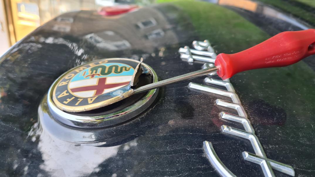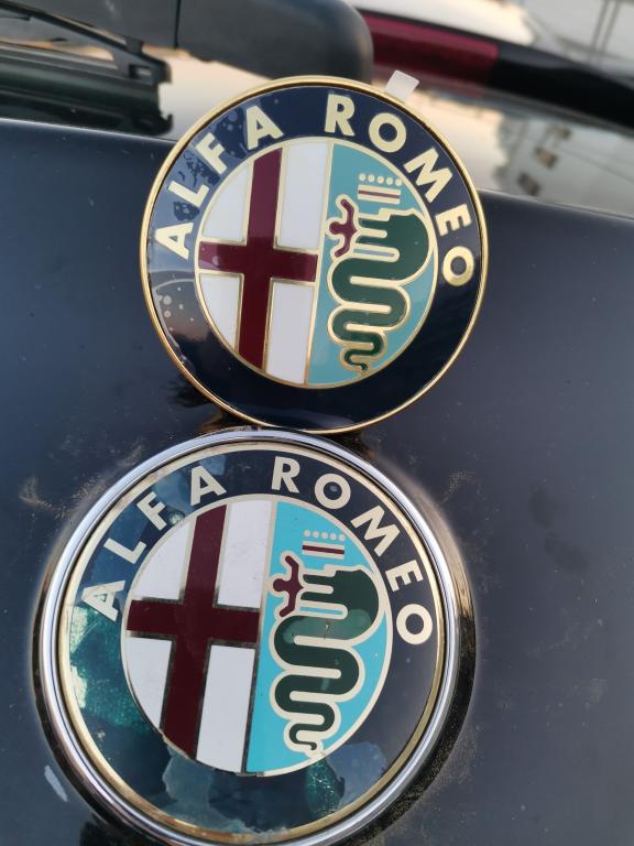 W Alfie Gulietta znaczek tył i przód mają po 74mm średnicy.Kiedy kupujesz zamiennik z powodzeniem możesz go założyć do przodu i do tyłu.Jeśli masz sprawny mikrostyk tylnej klapy to na luzie można go zdemontować i rozłożyć na części (znaczek zwolnić z plastikowych zabezpieczeń i delikatnie odkleić).Emblemat na przód różni się nieco od emblematu w klapę na mikrostyku,bowiem ten w klapie ma jeszcze blaszki na emblemacie służące do zagięcia go na plastikowy element mikrostyku(Kupując emblemat na przód bez blaszek możesz i tak go wkleić na plastikową część mikrostyku klapy po jego rozebraniu).Ci którzy kupują zamienniki często mówią że odpryskuje z niego lakier,aby się tak nie stało trzepa prysnąć go bezbarwnym lakierem w sprayu z marketu budowlanego i po sprawie,
