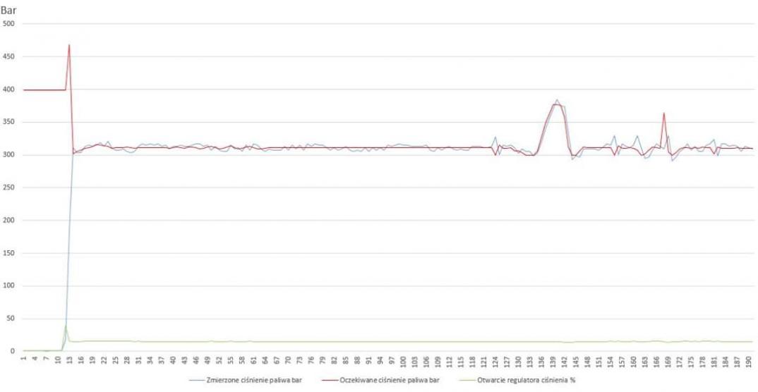 Wg mnie nie ma możliwości aby komputer sterował ciśnieniem ze względu na temperaturę, raczej steruje dawką paliwa. Skoro miałeś opiłki metalu na regulatorze to sprawa prosta. Pompa pada, zobacz jak wygląda filtr paliwa w środku i lepiej zrób to szybko bo jak opiłki pójdą na wtryski to po ptokach. Poniżej wykres jak wygląda ciśnienie u mnie w 1,9 jtd 115KM