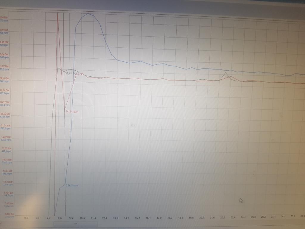 Widać, że rozruch zajmuje ok ~2s, rozrusznik wskakuje na 220br po 1.5 sec,
