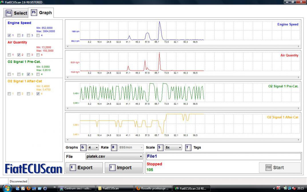 Włączyłem silnik i przejechałem się kawałek z podpiętym interfejsem. Po jakiejś 10 minutowej przejażdżce zatrzymałem się na chwilę i parametry sond były takie jak na fotce. A z danych zebranych przez FES sporządziłem wykres: