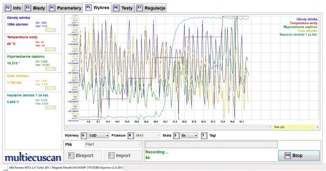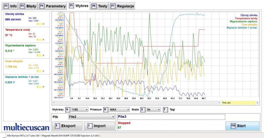 logi na zimnym to logi z pozycji kluczyka na MAR, bez uruchamiania silnika.... logi na ciepłym to nie logi z jazdy tylko po rozgrzaniu silnika , na biegu jałowym robimy logi.... MES-em można jeszcze zrobić rozgrzewanie silnika, na wykres dajemy takie parametry jak obroty silnika, temperatura silnika, napięcie sondy post-cat, czas wtrysku, wyprzedzenie zaplonu... wykres robimy do momentu aż sonda post-cat osiągnie napięcie > od 0.5 V..... przy rozgrzanym silniku, czyli temperatura wody większa od 55 st C, robimy taki sam pomiar i parametry na wykresie ale od momentu zatrzymania silnika, czekamy 1 minutę i wykres robimy od ponownego uruchomienia, wykres przerywamy jeśli napięcie sondy post-cat > 0.5 V.... ten test ma pokazać po ilu sekundach katalizator wypali tlen w spalinach z wydechu.....