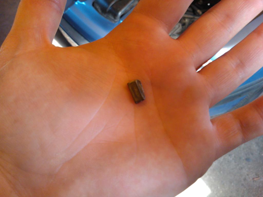 No więc. Bella już zrobiona. Okazało się, że winny całego zamieszania jest...kawałek metalu widoczny na zdjęciu. A mianowicie owy kawałek jest malutką częścią piasty czwartego biegu, który wraz z olejem w skrzyni pływał sobie prawdopodobnie już dłuższy czas. Po wrzuceniu luzu ta drobinka sobie tylko znanym sposobem dostała się pod wybierak. Jako, że piąty i szósty bieg są w najniższym poziomie wybieraka, nie dało się ich wrzucić gdyż ten swoją pracę kończył na tym kawałku i niżej nie schodził. Można więc rzec, że od 5 i 6 biegu dzieliła mnie grubość tej drobinki metalu :P