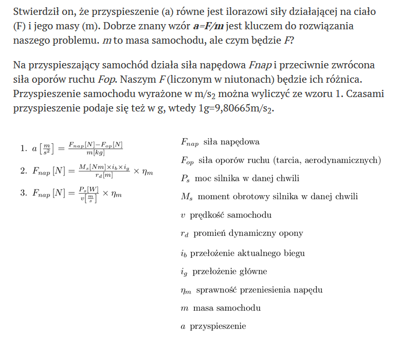 Nie tylko. Wbrew powszechnej obecnie ekscytacji momentem obrotowym, za przyspieszenie również odpowiada moc silnika. Przyspieszenie wprawdzie wynika z momentu obrotowego na kołach, jednakże moment obrotowy na kołach wynika właśnie z mocy silnika.