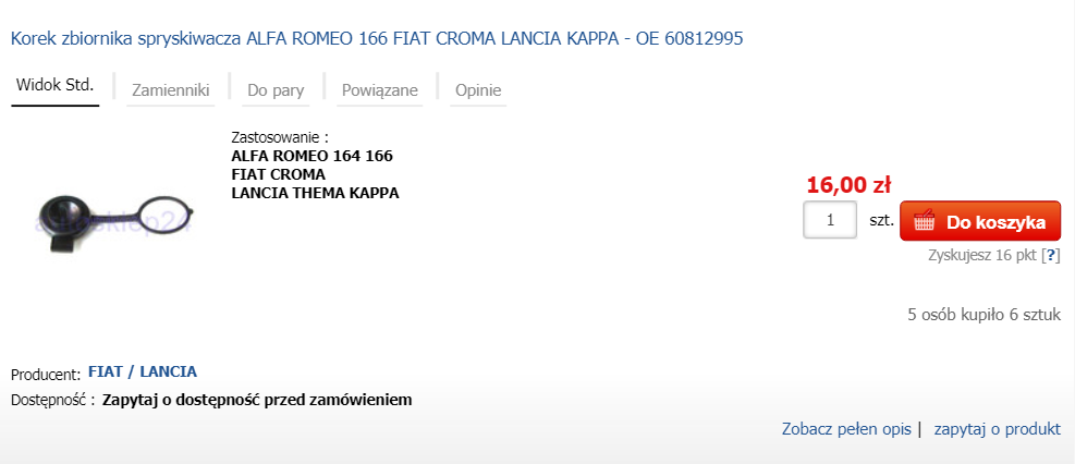 Jakby ktoś szukał to na autosklep24 jest oem korek zbiornika spryskiwacza :) 16 złociszy.