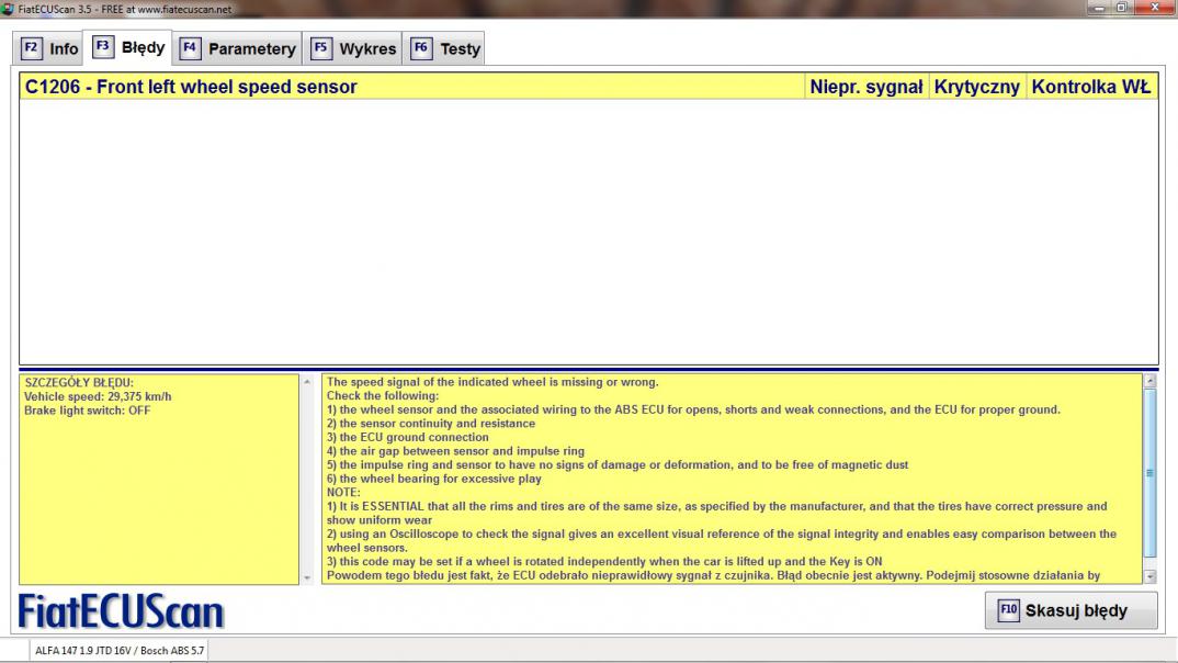 Witam. Mam problem z błędem C1206. Wymieniłem lewy przedni czujnik ABS i nadal to samo. Ciągle świecą mi się kontrolki ABS, VDC i ASR. Pomoże ktoś?
