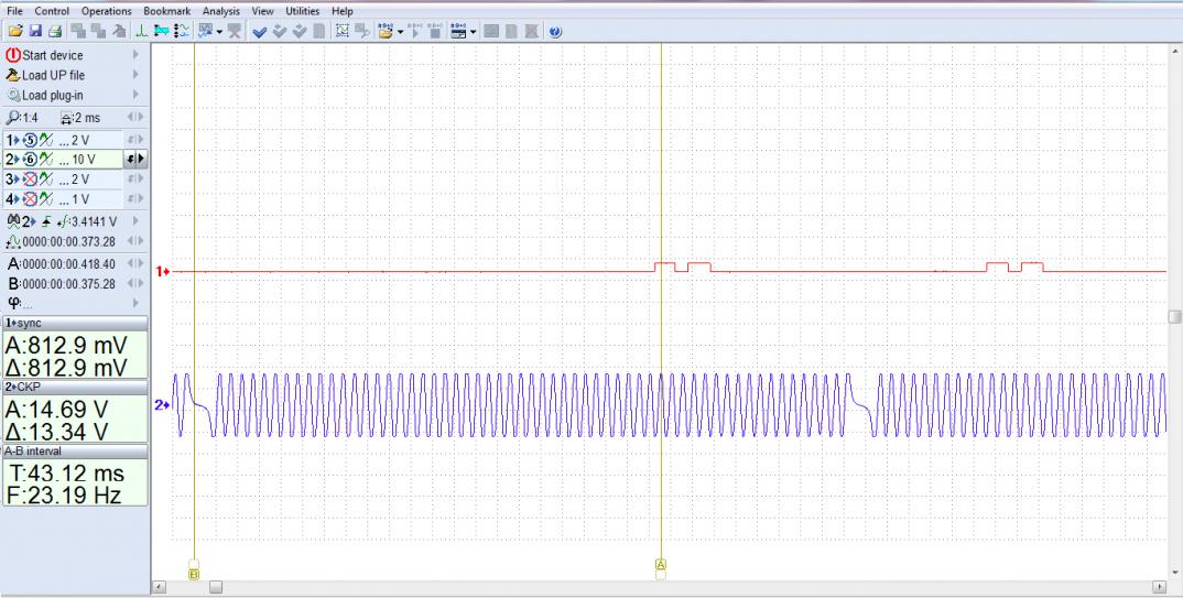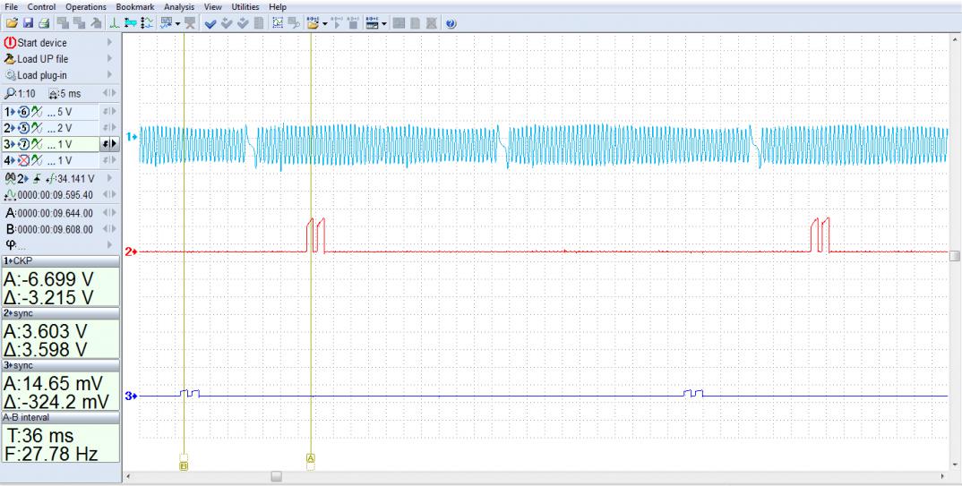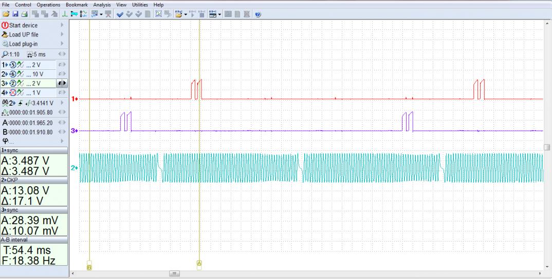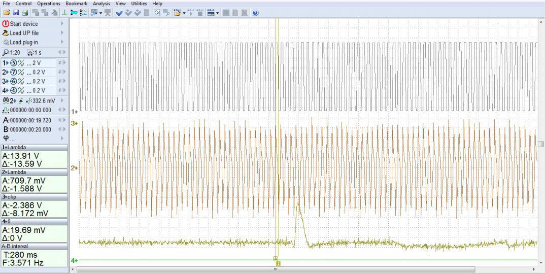 -- nie mogłam jednoczasowo, zbierać tych sygnałów z sond lambda i CKP, ponieważ oscyloskop nie rejestrował impulsów kanałach dla lambda. Tylko napięcie pokazywał. Czy to ma związek, że za mała częstotliwość była dla tego typu sygnałów?