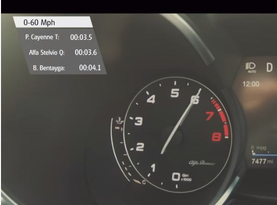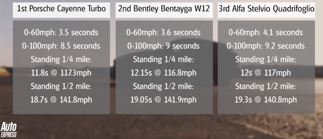 Porsche nie jedzie w trybie sport, deski rozdzielczej Bentleja nie pokazano. Nie wiadomo czy było użyto launch control w tych samochodach. Na pewno Stelvio nie ruszyło zgodnie z instrukcją: hamulec + lekko gaz -> puścić hamulec + gaz w podłoge, tylko po prostu gaz w podłoge. Stelvio zatankowane do pełna, ile jest w pozostałych - nie wiadomo :D