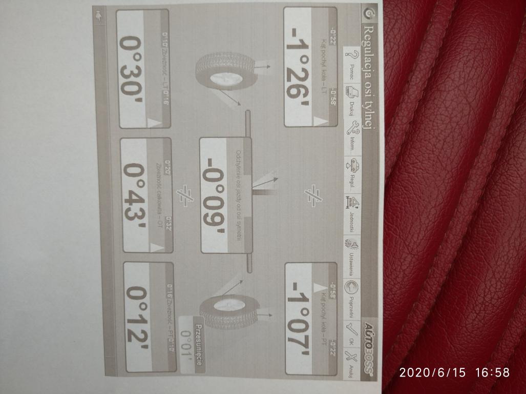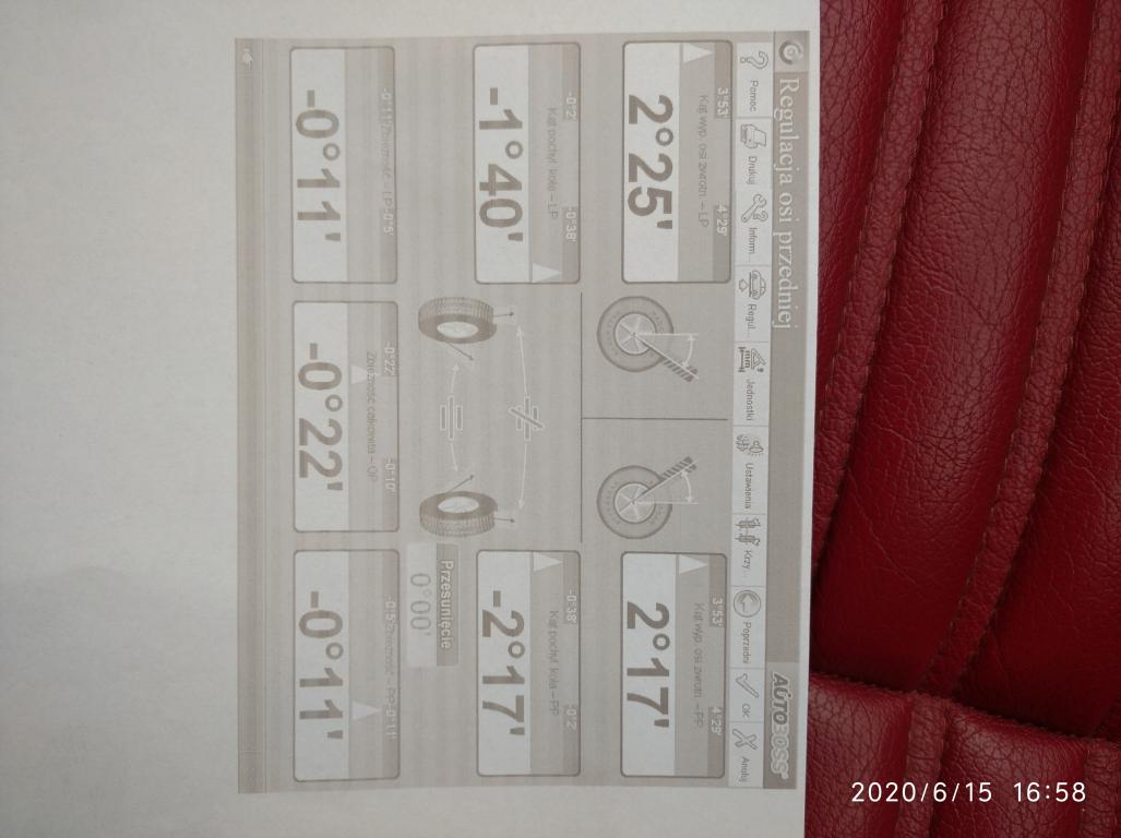 Tak jak się spodziewałem kąt pochylenia przednich kół ponad norma, ale niestety kąt wyprzedzenia sworznia zwrotnicy lewej strony nieprawidłowy.