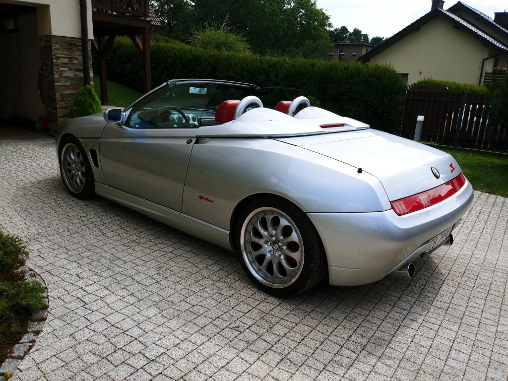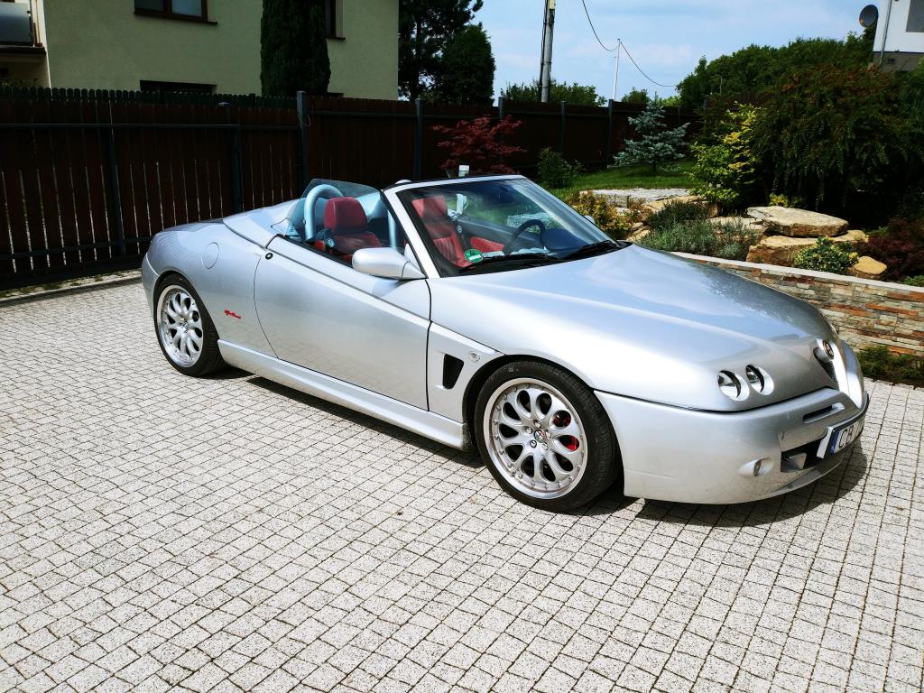 Panowie, po 1.5 roku rozglądania się za GTV lub Spiderem z Busso 3.0/3.2 w końcu mogę się przywitać jako i właściciel. Wczoraj kupiłem Spidera 3.0 12V i w końcu mam auto z czerwonymi skórami (w Giulii nei mogłem zamówić do Misano nad czym do dziś bardzo ubolewam). Ma pakiet Zendera łącznie z całymi zderzakami (nie dokładka - przedni mi tak średnio się podoba, może kiedyś wrzucę jednak ori a tylko z dolną dokładką?), wnętrzem i dokładką pod dach (jej też nie wiem czy się nie pozbędę). Ogólnie auto jak na swój wiek i to co spotyka się najczęściej raczej w ciut lepszym stanie - widać że garażowane i miało okres gdzie było mocno dopieszczane, choć ostatnio może ciut gorzej z tym - mimo że wiele rzeczy zrobionych niedawno (np zaciski hamulcowe, remont felg, tarcze, klocki, nowa chłodnica), auto było raz już malowane (po całości 200-300um), jednak 22 lata zrobiły swoje i tak na zewnątrz prawie każdy element czy ma obicie czy rysę czy wgniotkę, albo po prostu wypiaskowało od kół. Trzeba podłogę odgruzować (ma mikro spoty powierzchniowe, tak ładnej i tak nie widziałem jeszcze z tych oferowanych, co i tak niewiele zmienia)/zakonserwować, wahacze tył nie były ruszane jeszcze i też się tym w pierwszej kolejności muszę zająć. Boczny element dachu na zagięciu ma małą dziurkę już niestety, trzeba też jakoś ogarnąć przez zimę. Fotele wiadomo do odrestaurowania. Kontrolka poduszki zaświeciła, wiem że ponoć standard z wiązką pod fotelem. Mam czym się zajmować na najbliższe lata.