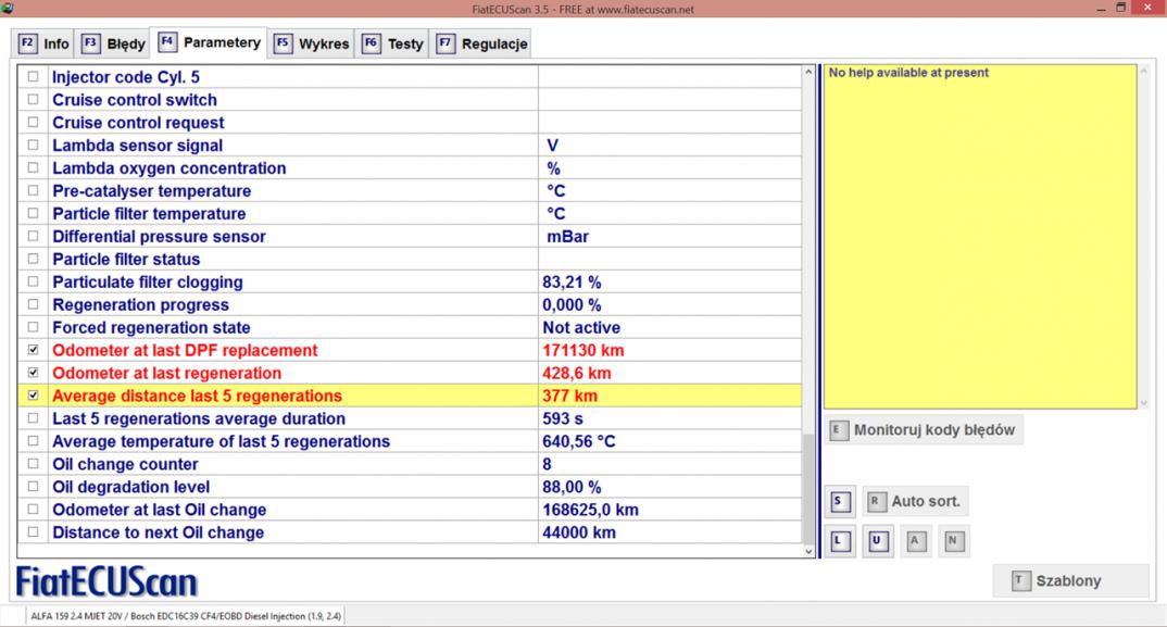 Tak samo drugi parametr pokazuje przebieg od ostatniego wypalenia DPF (sporo powyżej średniej, więc trasa zrobiła swoje) a nie jak twierdzi opis "stan licznika przy poprzednim wypaleniu".