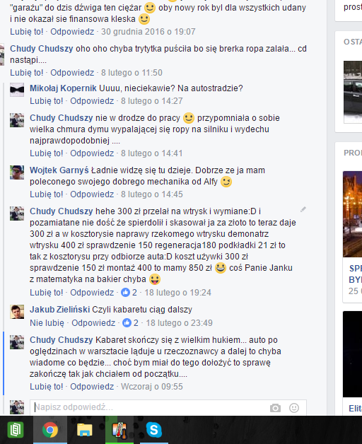 Sprawa nadal nie jest zamknięta. Auto aktualnie stoi w Warszawie u mechanika który ma ocenić stan silnika po remoncie(dłubaniu) Janka zzamechemu. Na pierwszy rzut oka brakuje osłony pod autem, głowica jest źle dokręcona i pluje olejem, jest nieszczelność gdzieś w ukladzie paliwowym i ropa sie po nim leje. Nie wspominając o tym że Janek wogole nie wymienił dziurawej rurki od wspomagania która cały czas cieknie o co go prosiłem. Zobaczymy, co wyjdzie dalej. Czyli odebrałem od Janka auto z którego leje się ropa, olej silnikowy i płyn od wspomagania. Widać potrafi uczynić by włoszka była mokra, nie ma co.
