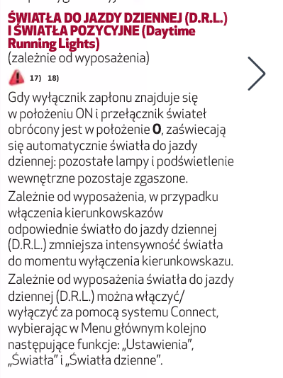 "W pojazdach zarejestrowanych po dniu 31 grudnia 2009 r. połączenie elektryczne powinno być takie, iż światła do jazdy dziennej powinny automatycznie się włączać, kiedy urządzenie włączające lub wyłączające silnik znajduje się w położeniu umożliwiającym pracę silnika. Przednie i tylne światła pozycyjne oraz oświetlenie tablicy rejestracyjnej nie włączają się, jeżeli włączone są światła do jazdy dziennej."