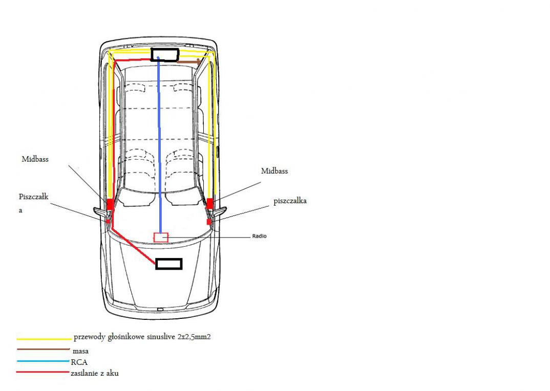 Zasilający i masa powinny iść jedna stroną (najlepiej lewą, bo tam lecą kable instalacji na tył auta), a głośnikowe obydwa i sygnałowy drugą stroną auta (prawą) lub środkiem. Popraw kable, bo teraz masz głośnikowe poprzeplatane raze z zasilającymi.
