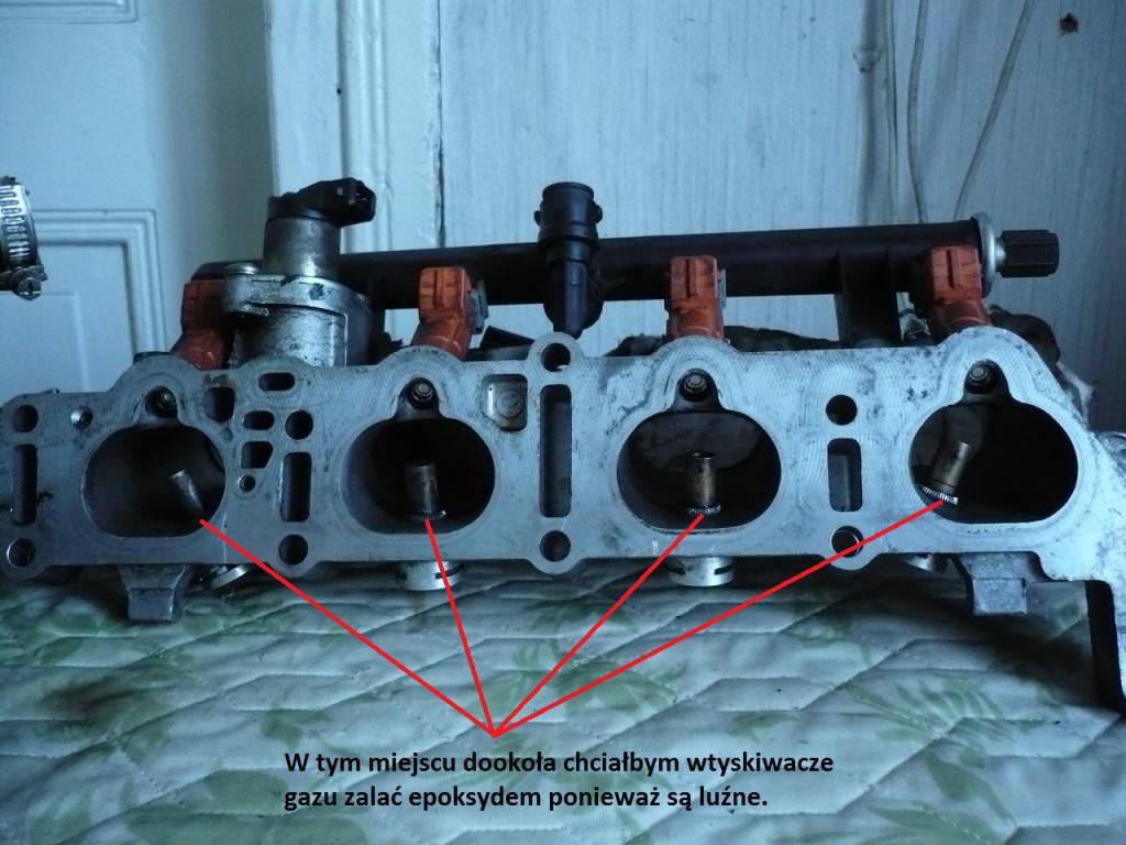 Zauważyłem, że wtryskiwacze są lekko luźne. Z zewnątrz kolektora (krótkiego) zaleję je żywicą epoksydową dookoła i będą na sztywno. Nowy kolektor dolotowy będę miał we wtorek to do tego czasu ładnie wszystko wyschnie.