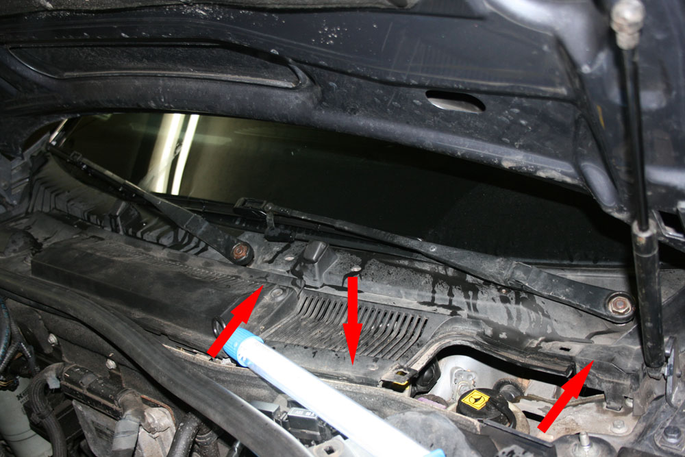 1. Odkręcamy śrubki z plastików podszybia, odkręcamy wycieraczki i zdejmujemy gumę na ścianie grodziowej.