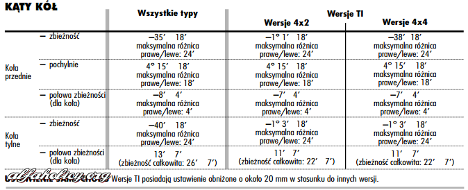 No i tego z instrukcji nie rozumiem. Załącznik 225554 Nie ma tu pochylenia kół tylnych? I tak to oglądając to różnica w geometrii pomiędzy przednionapędówką a 4x4 jest tylko w zbieżności kół przednich? Cała reszta jest Taka sama w obu przypadkach? Czyli kąty przód i tył i zbieżność kół tylnych jest taka sama?