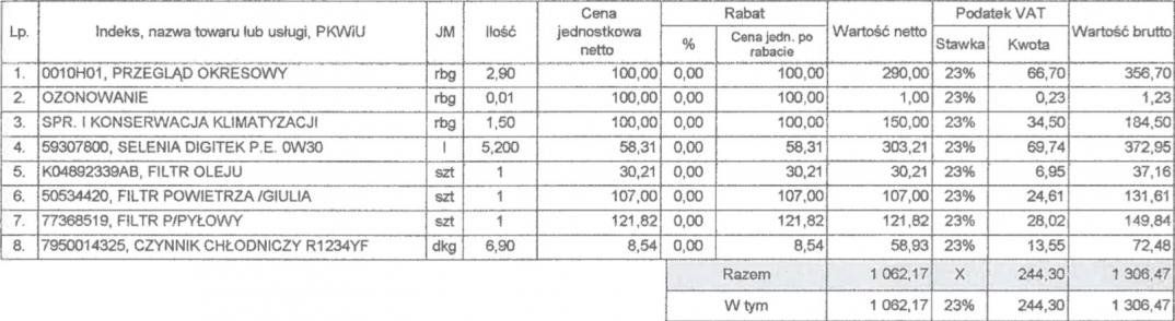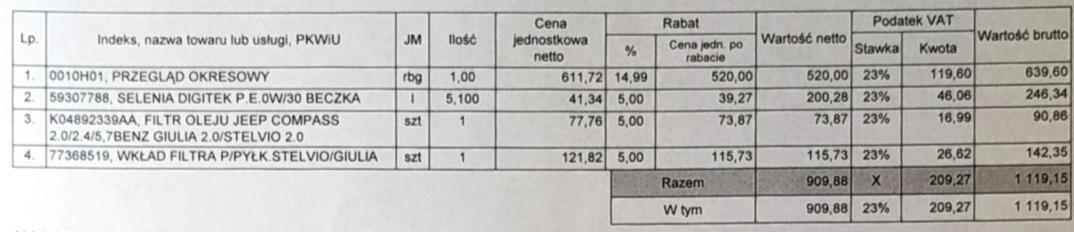Z wymianą filtra kabinowego oraz oleju wyszło 780 zł brutto.