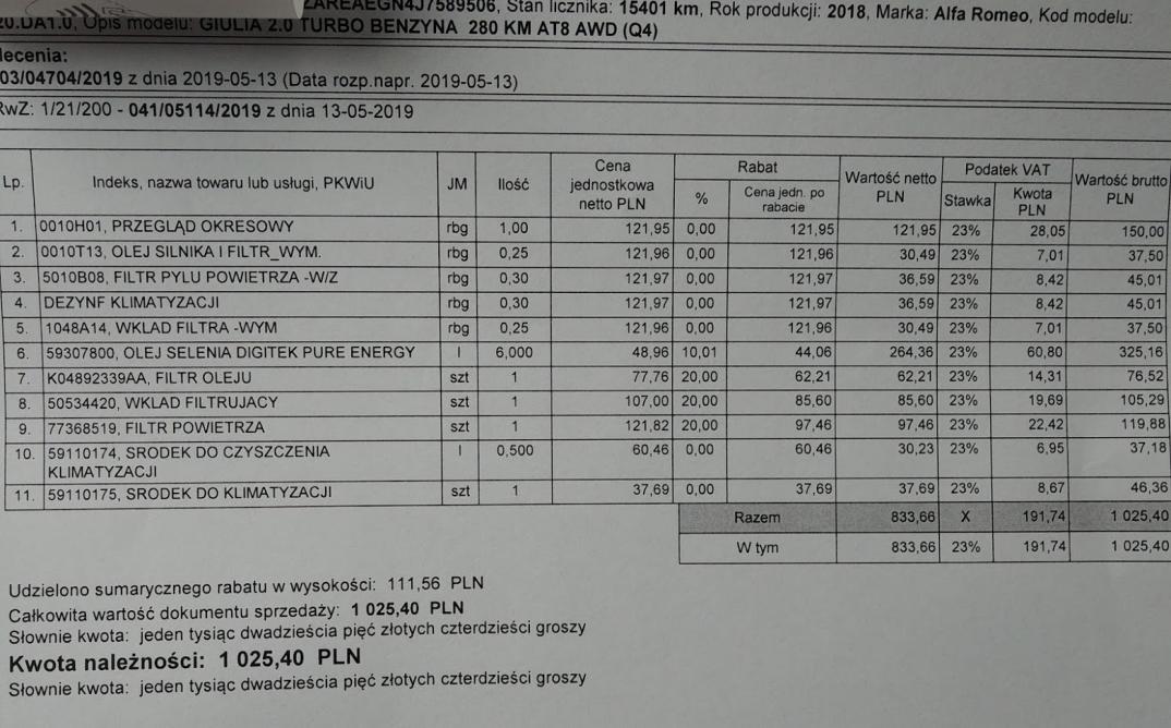 Jeśli nie ma tam żadnych innych czynności to uważam, że to rozbój. Bo ten sam olej, i filtry, i analogiczny I przegląd po 15 000 zl w Giulietcie to ok. 700 zl w Warszawie. To za co tutaj 377 zl wiecej?