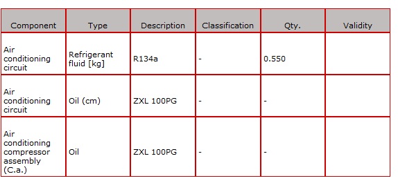 Component Type Description Classification Qty. Validity Air conditioning circuit Refrigerant fluid [kg] R134a - 0.550