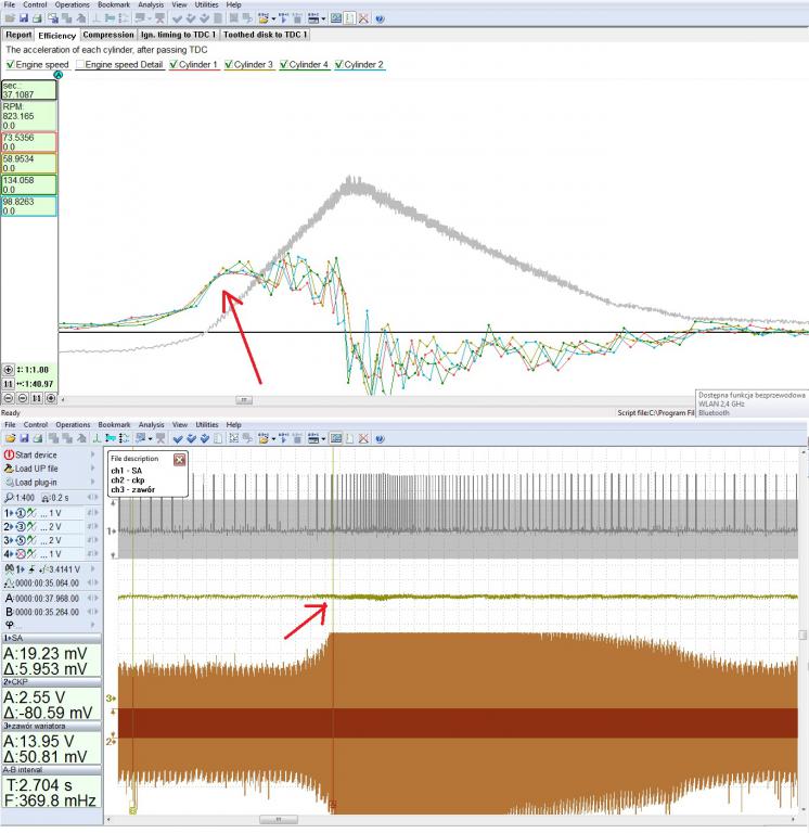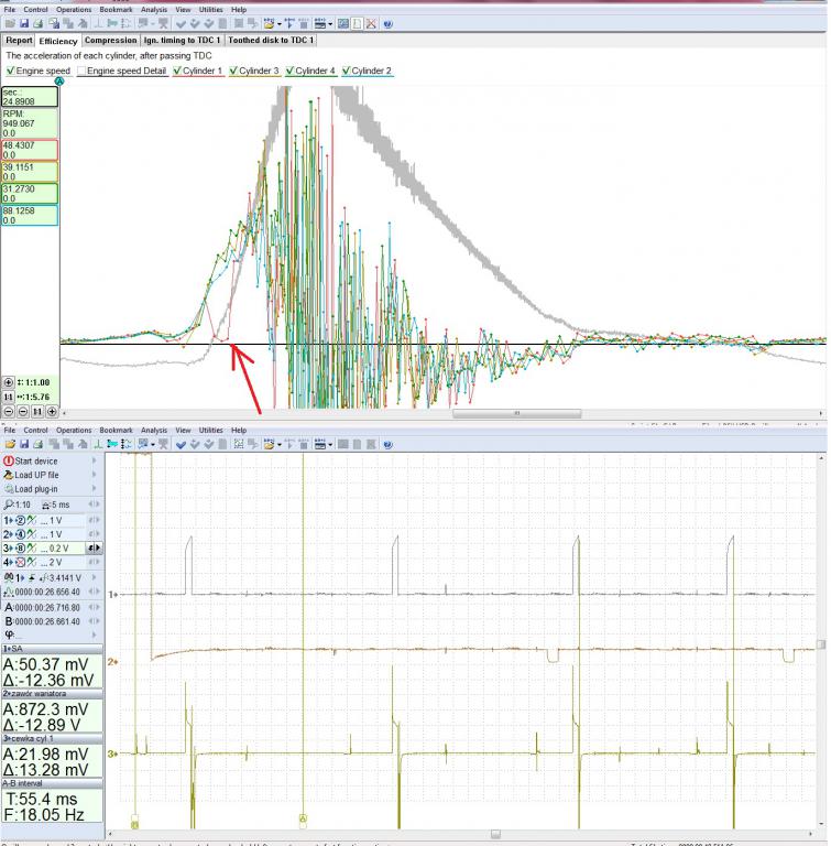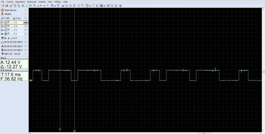 Wykres zielony, jeśli pochodzi z czujnika wałka, to nie jest prostokątny. Trzeba korygować ustawienia oscyloskopu na kanale, tak by krawędzie oscylogramu się wyprostowały.