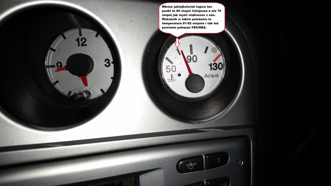 Mam nadzieję że powyższe ilustracje rozwieją wątpliwości wielu osób, tak jak rozwiały moje. Teraz stwierdzę całkowicie inną rzecz. Wskaźnik w 156 nie przekłamuje, a wręcz przeciwnie- jest bardzo dokładny. Widzi odchylenia o 1 stopień nawet. Osiągając drugą kreskę mamy 80 stopni. Podczas spokojnej jazdy przy obecnych zimowych warunkach otoczenia mając lekko ponad drugą kreskę mamy jakieś 82-83 stopnie co nie jest dziwne dla JTD z racji dobrego układu chłodzenia. Przyjmując że 2 krecha to 80 i patrząc na wskaźnik lekko wychylony poza i na temperaturę w FES'ie wszystko gra i jest tak jak powinno być. Teraz już wiem że mam na pewno sprawny czujnik. Uważam również, że tzw. wachlowanie temperaturą teraz w zimie to nic dziwnego bo jak się nam zmieni temperatura z 86 na 82 to i wskaźnik się rusza bo jest po prostu dokładny. Tak jak powyżej pisał kolega Jaboleq, przyjdzie lato to wskaźnik będzie stał na 90 i jestem w stanie w to uwierzyć bo temperatura otoczenia urośnie to i zarazem silnik nie będzie tak się schładzał.