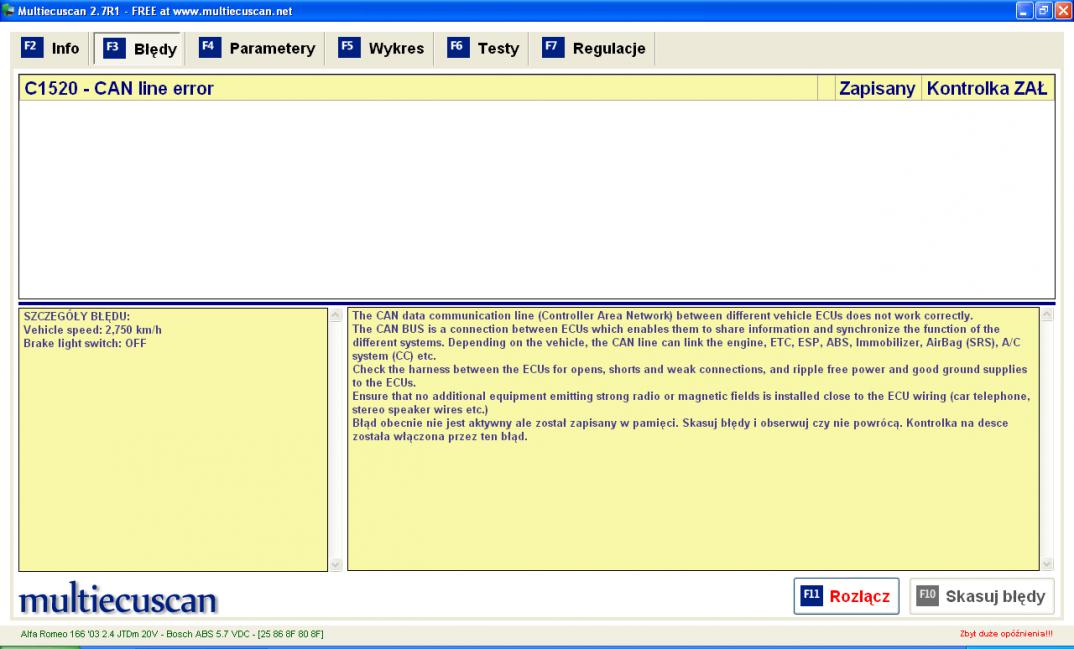 Jednak po podłączeniu do ABS-u pojawił się następujący błąd:
