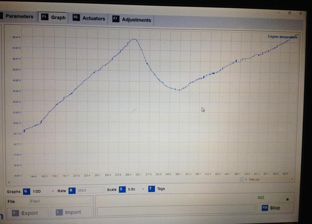 Tak jeszcze przegladam ten swoj dzisiejszy log i widze, ze termostat zamyka się przy 79'C. Jak widac u mnie dosc szybko sie silnik schladza podczas spokojnej jazdy. Otwarcie termostatu uzyskalem tylko dlatego ze "pociągnąłem" na prostej.