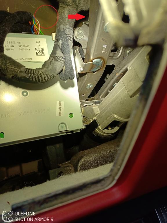 Po przeczytaniu kilku porad z wymiany bypassu, zabierałem się do tego jak "pies do jeża" i nastawiałem się na krew, pot i łzy. Tymczasem zajęło mi to 15-20 min od momenty złapania śrubokrętu do wykręcenia schowka "na okulary", do jego odłożenia po całej operacji. Lewą rękę wsadziłem w miejscu gdzie jest czerwone kółko na zdjęciu (niestety, dłoń i przedramię nie może być "kulturystyczne"). SGW był tam gdzie czerwona strzałka. Krótki śrubokręt złapałem kciukiem i palcem wskazującym i w ten sposób naciskałem języczek wtyczki. Jednocześnie pomiędzy małym palcem a dłonią trzymałem przewody, lekko je ciągnąc. Po naciśnięciu śrubokrętem języczka wtyczki (zaznaczone na zdjęciach na czerwono) wypięła się ona bez problemu. Potem wystarczyło tylko na chybił-trafił wpiąć bypass. Zdjęcia zrobione endoskopem przed wypięciem SGW (trochę się obiektyw zabrudził, stąd kiepska jakość).