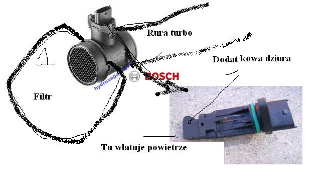 Załącznik 49752Biorąc pod uwagę zasadę działania przepływomierza robienie dziury w obudowie czy wkladce nie ma sensu. Przynajmniej w silnikach benzynowych. Dodatkowe powietrze nie wpływa na wartości jakie wysyla czujnik do ECU a ilość paliwa jest odpowiednia do pomiaru ilosci powietrza. Wynika z tego ze mieszanka bedzie zbyt bogata w powietrze. Wydaje mi sie ze dobrze rozumuje.....