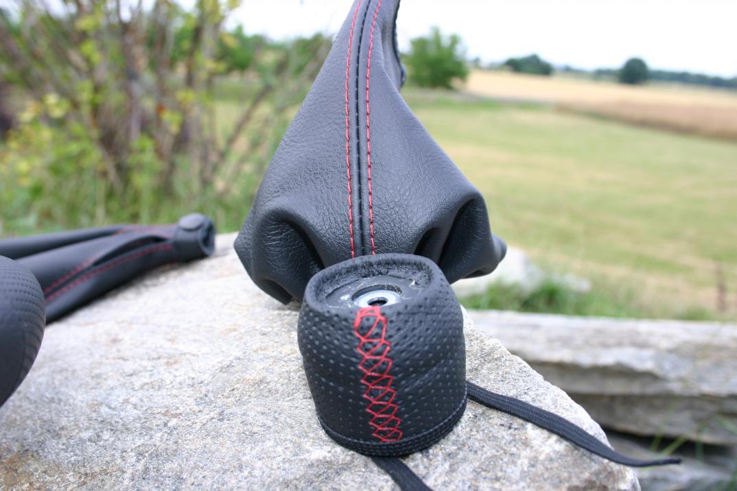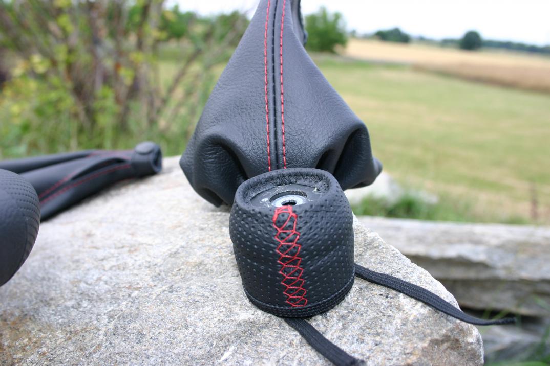 Jaka cena za mieszek zmiany biegów i hamulca ręcznego ze skóry perforowanej z czerwoną nicią oraz klipsem?