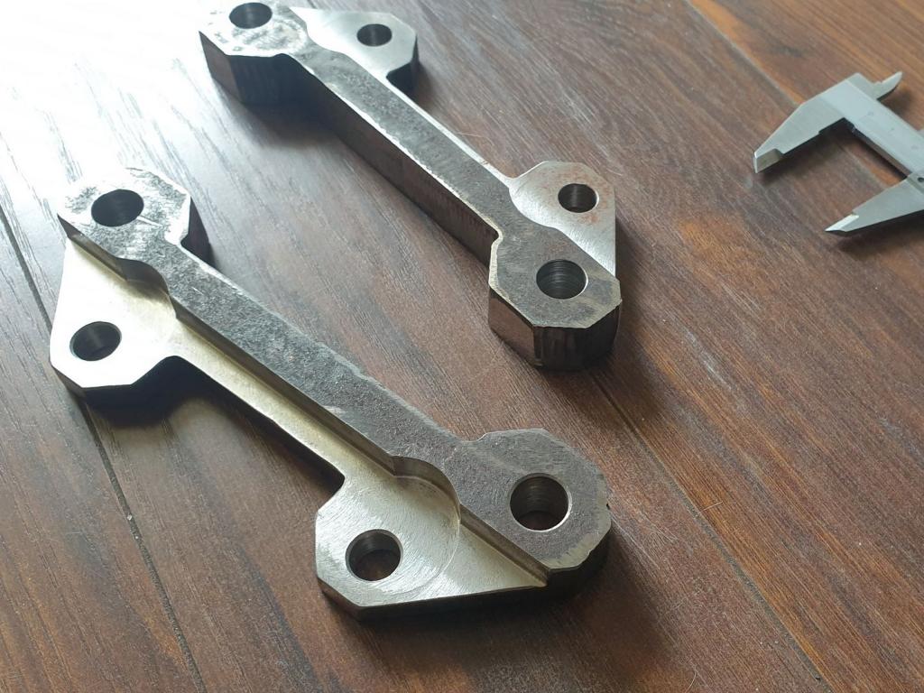 Co do rysunków poszerzeń zacisków pod tarczę 32 mm, to ja u siebie najpierw zrobiłem szablon na kartonie, odrysowałem fragment na zacisku, potem przeniosłem go na blachę aluminiową 4 mm, a dalej to już zabawa z wyrzynarką i pilnikiem.