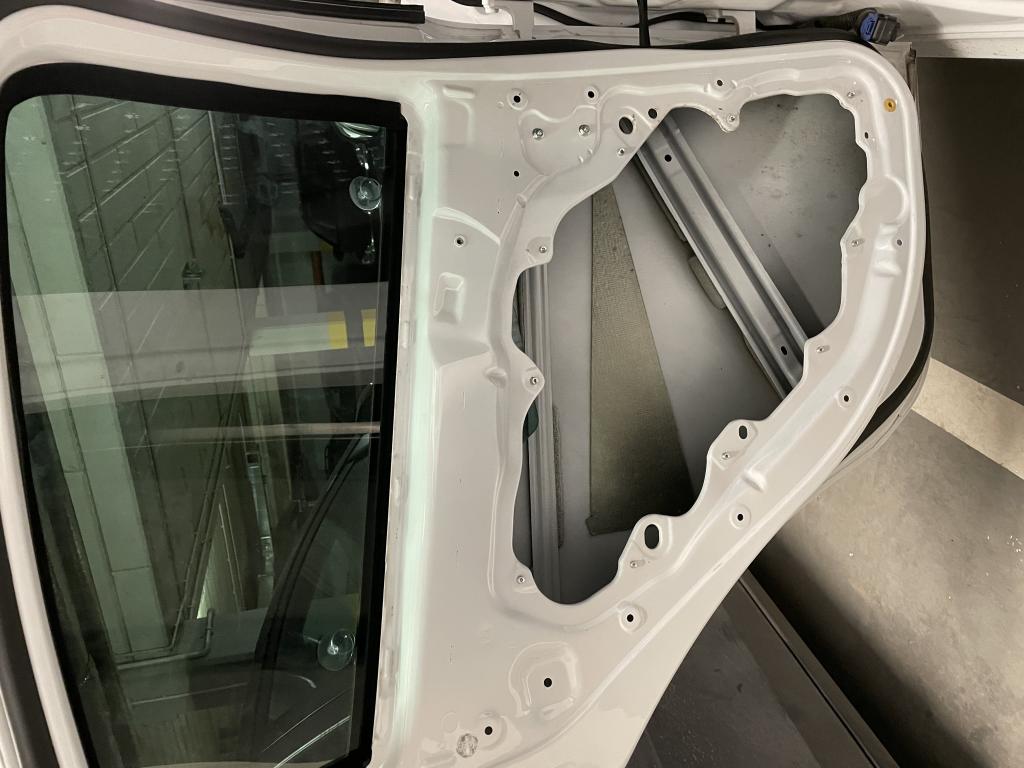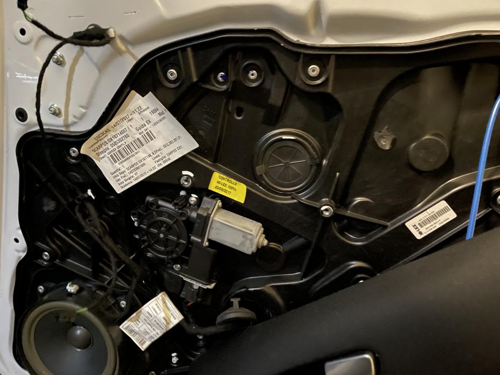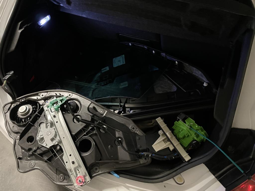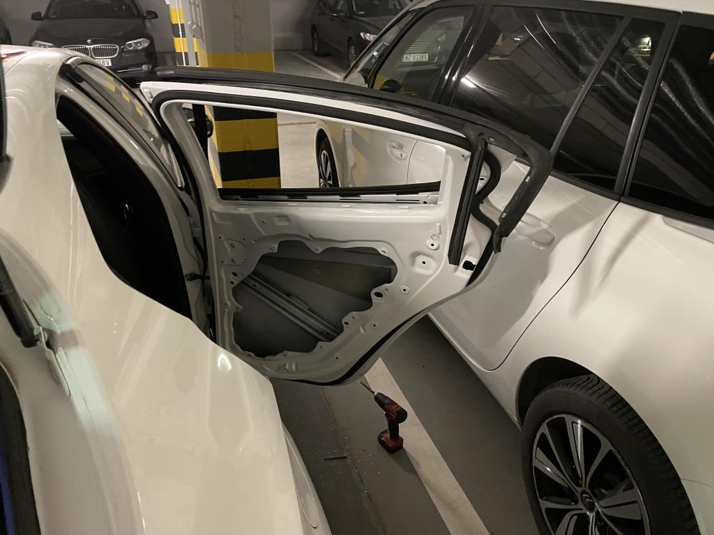 Po rozwierceniu nitów, okazało się że wcale nie będzie tak przyjemnie. Trzeba odkręcić zamek, klamkę zewnętrzną, zdjąć uszczelki, wyjąć szybę... jednym słowem rozebrać drzwi do gołej blachy. Po tym procesie pozostaje zamocować wiązkę lampki według schematów wyżej i wszystko poskładać. Trochę problemu sprawiły resztki nitów, które ciężko było wyciągnąć z blachy w drzwiach.
