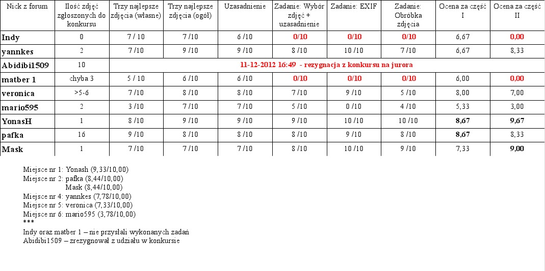 Po zapoznaniu się ze wszystkimi zgłoszeniami, oraz przeanalizowaniu wykonanych przez uczestników zadań, jednogłośnie uznaliśmy iż najlepiej w konkursie poradził sobie YonasH. Równie dobrze zaprezentowali się Pafka, oraz Mask. I to właśnie te trzy osoby zasilą grono jury konkursu fotograficznego.