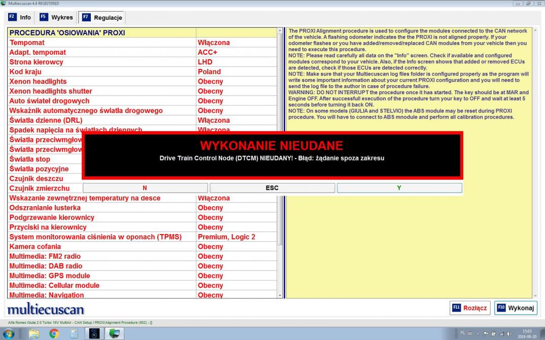 The “out of range” error usually means that there is an option in PROXI which is not supported by the module or not compatible with it. This happens on some Giulia/Stelvio DTCM modules when you try to enable race mode. Unfortunately, we do not know the reason. It could be old firmware version of the DTCM that does not support sport mode. It could also be related to another PROXI option (activated in your proxi configuration) which is not compatible with sport mode.