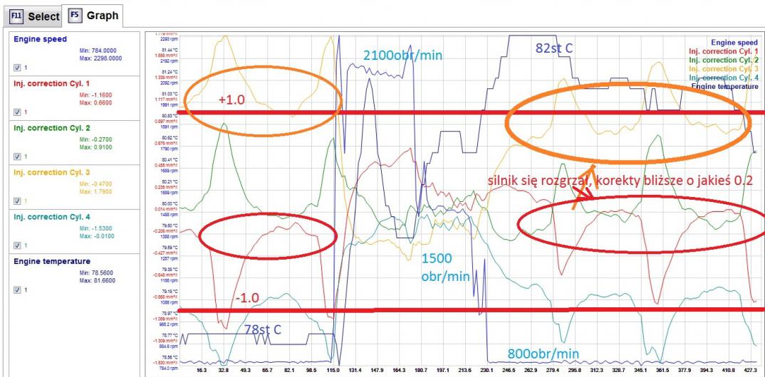 Po minimalnym podniesieniu obrotów korekty zbliżają się do 0 - np inny przebieg jaki zarejestrowałem dla ok 1500obr/min - ładnie wszystko trzyma się zera. Tak samo jak próbowałem 2000obr/min czy 3500obr/min. Przy najbliższej okazji spróbuję sprawdzić minimalnie wyższe niż wolne - ok 1000-1100, zobaczymy co wyjdzie. Poniżej wklejam wyniki jakie uzyskałem - silnik był troche już przestudzony na początku testu (78st C) wolne obroty, potem 2100obr/min, potem 1500obr/min i potem znowu wolne. Widać że korekty są bardziej "odjechane" gdy silnik jest lekko niedogrzany, bo potem jest jakieś 0.2 lepiej dla 3 i 4 cylindra - to co pisałem w poście wcześniej, że jak rozgrzał się jeszcze lepiej to się jeszcze bardziej wszystko zbliżyło: