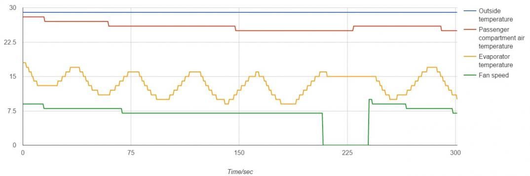 Tak wygląda wykres z parownikiem. Zadana temperatura to 18*C. Klimatyzacja powoli zmniejszała temperaturę wewnątrz auta. Od 31 stopni do około 22 w ciągu bo ja wiem 5-10 minut. Czyli sporo za wolno moim zdaniem. Chwilowy spadek i wypłaszczenie parownika to wyłączenie klimatyzacji.