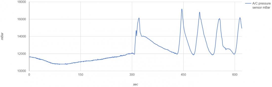 A tu mamy ciśnienie. Początek wykresu to ciśnienie z ustawieniem na 16*C i brakiem porządnego chłodzenia. Później wyłączenie klimy na 5-10 sekund i odpalenie jej z powrotem i mamy drugą połowę wykresu w trakcie której klima bardzo szybko chłodziła wnętrze auta. Zaznaczę, że parametr 'żądania sprężarki' był cały czas na ON.