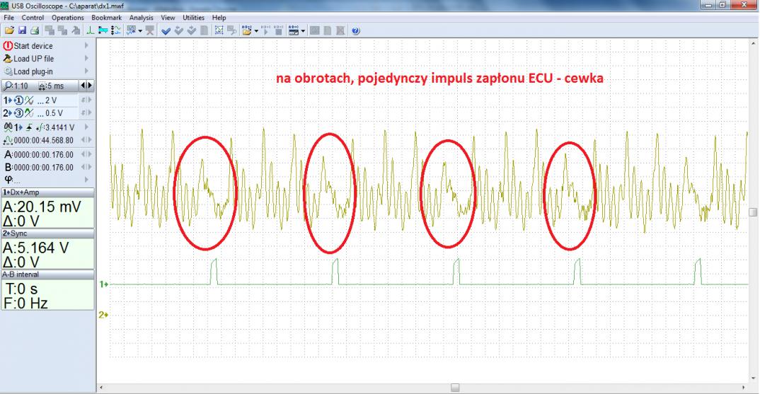 No, tak - Dx – panel liczy fazę pokrycia zaworów. Tylko, że to jednak wykres podciśnienia. Sama nie wiem, autor skryptu opisuje te pulsacje jako pracę zaworów. Pulsacja jest chyba dobra. Tylko, że te piki są wyraźnie niższe na 1 cyl. – no inne, to myślałam, że jednak tłoki będą tu miały znaczenie. No i obraz się nie zmienia bez względu na ustawienie wałków, czyli kątów względem pozycji tłoka. W sumie nadal nie umiem wyznaczyć fazy pokrycia zaworów z Dx, to by mi się przydało, aby to umieć. Jest też wykres z rury wydechowej, a to widać, że zapłonu nie gubi na jałowym, mają te zadziory, takie podwójne jakby są, tylko, że jest open loop, a jednak w tych wykresach sporo zależy od sterowania ECU.
