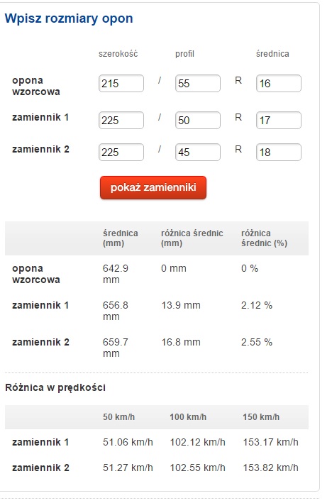 średnica opony 225/45/18 jest większa niż w podstawowym kole 215/55/16 aż o 13,9mm, a od oryginalnej opony 225/45/17 też jest większa o 2,9mm - jak widać przelicznik producenta nie jest idealny i przy każdym rozmiarze prędkościomierz pokazuje co innego...