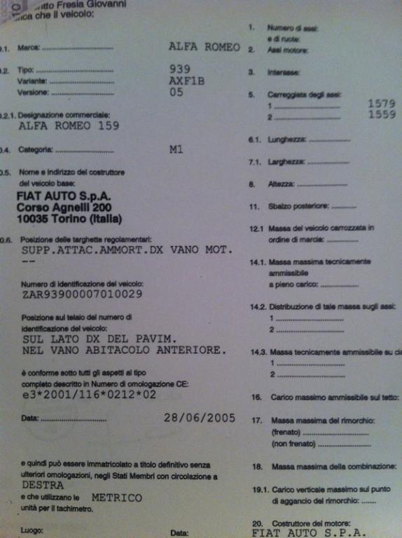 SV: 140.394.0 Nr.nadwozia: 07111263 Nr rej.: 76XKNJ VIN: ZAR93900007111263 Nr silnika: 5410910 Przebieg km: 50765 Data początku okresu gwarancji: 27-06-07 Ograniczenia gwarancji: Kod koloru zewnętrznego: 568 Opis koloru: Sprzedawca: 0003722 - Rynek: 3722 OLANDA IMPORT.ALFA Właściciel: J.R. Voerman