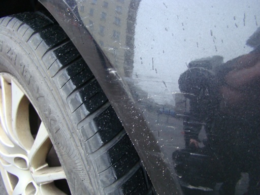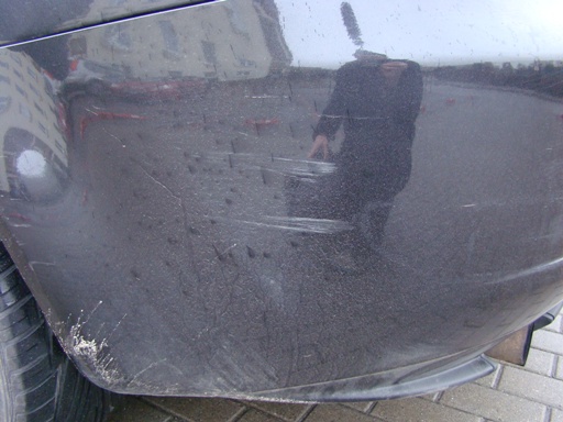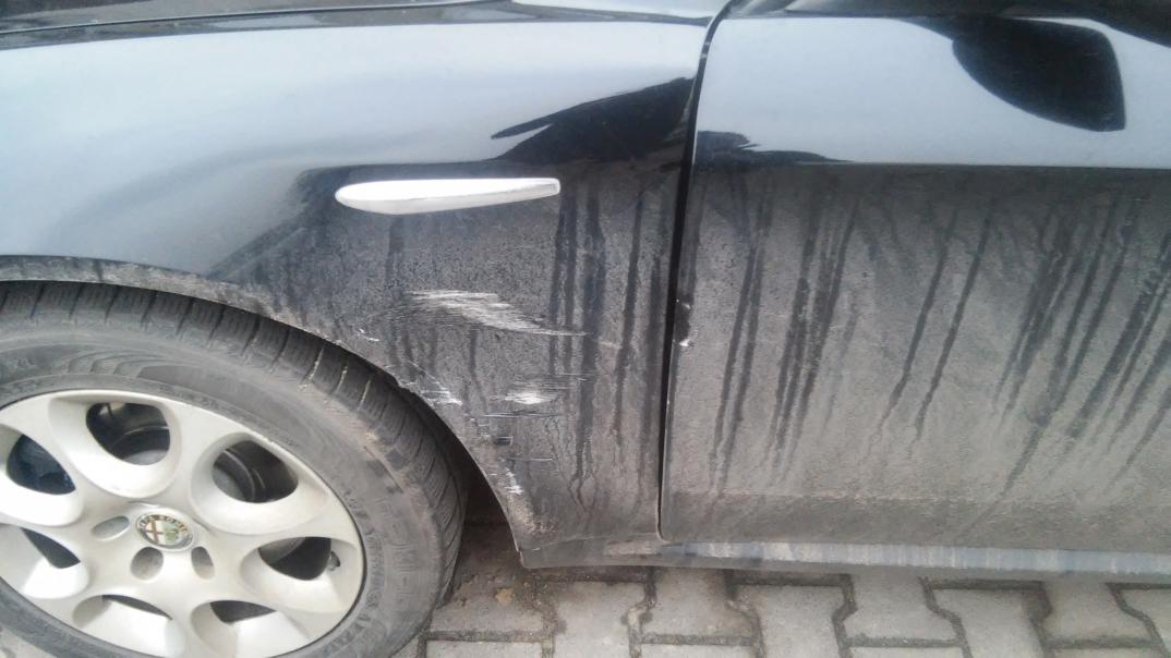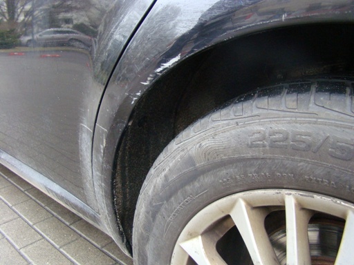 Uszkodzenia to lekkie wgniecenie i zrysowanie lewego tylnego nadkola, zarysowanie tylnego zderzaka, zarysowanie krawędzi drzwi (prawie niewidoczne).